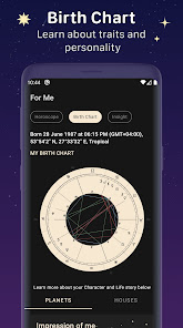 이 점성술 앱은 출생 당시의 행성 좌표를 천문학적으로 엿볼 수 있는 출생 차트를 생성합니다. 조디악 차트를 사용하여 다양한 점성술 요소를 해석하여 삶의 다양한 측면을 알 수 있습니다.