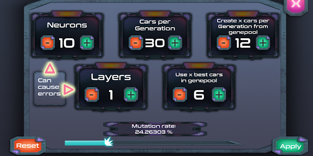 Watch a neural network as it learns to drive a parkour with a car. Adjust the settings of the AI to observe the effects on the AI and the neural network's behavior.