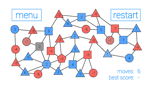 Shape Shift는 그래프 이론을 기반으로 한 퍼즐 게임입니다. 연결된 모든 포인트에서 보내거나 요금을 청구하려면 노드를 누릅니다. 승리하기 위해 모든 포인트를 긍정적으로 만드십시오! 각 퍼즐을 몇 개의 움직임으로 해결할 수 있습니까?