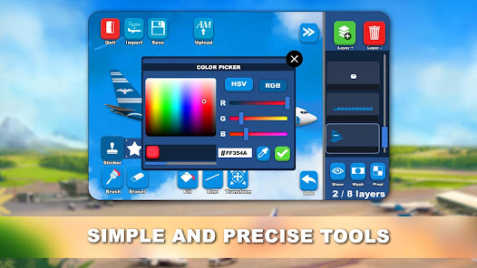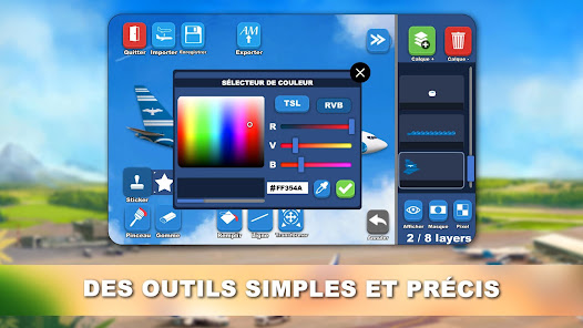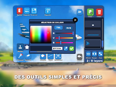 당신은 당신이 정확하게 당신이 색상 선택기 덕분에 원하는 색상을 선택할 수있는 가변 크기, 직선, 페인트 통 및 팔레트의 브러쉬로 항공기의 모든 부분을 페인트 귀하의 처분에 많은 도구를해야합니다.