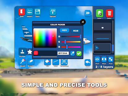 완료되면, 당신의 liveries은 휴대 전화 메모리에뿐만 아니라 클라우드에 저장할 수 있으며이 항공기의 각을 맞출 수 있도록 수입했다.