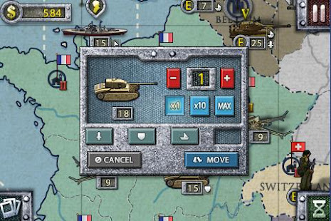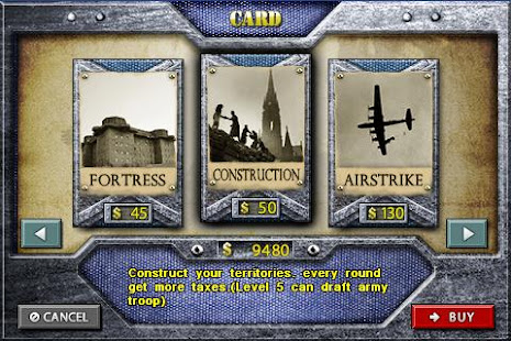 During the game you need to operate and distribute the three basic troops reasonably which include soldiers,tanks and artillery.(Soldier troop with high yields but general attack,tank troop with high attack and continue action when complete destroying the enemies,artillery troop attacks soldier troop and tank troop while they cannot strike back),judge on the current situation correctly at any time for the AI is outstanding.The attributes of arms are different from each country.For example,the tank of Germany is most powerful but with high price,the soldier of Soviet Union is cheapest,the navy of Britain is best.
