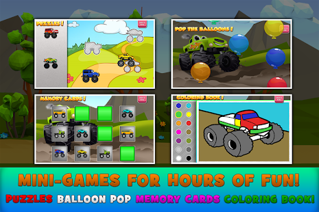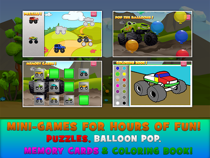 Monster Trucks Kids Game은 자녀가 모바일 및 태블릿 장치 사용의 교육 메커니즘을 이해하도록 도와줍니다. 퍼즐, 메모리 카드 및 수많은 재미있는 레이싱 액션이 있습니다.