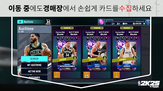 경매장을 통해 언제 어디서나 선수 카드를 사고팔 수 있습니다. 오랫동안 찾아 헤매던 인기 NBA 선수 카드를 찾아 컬렉션에 추가하거나, 보유한 카드를 시장에 내놓아 보세요. 경매장을 통해 간편하게 컬렉션을 강화하고, 코트를 지배할 한 수를 준비할 수 있습니다.