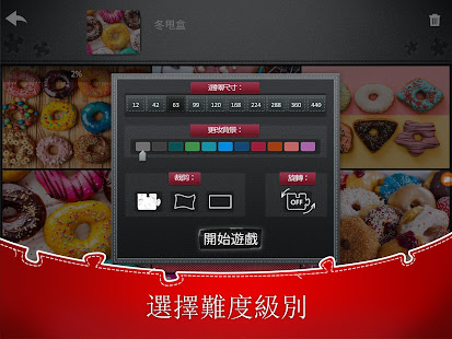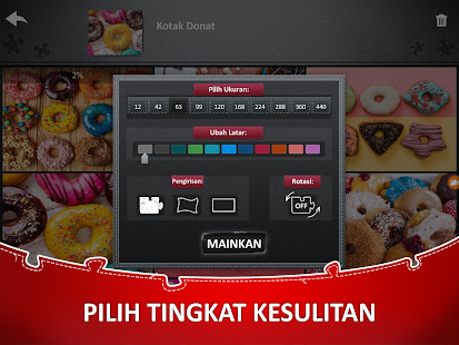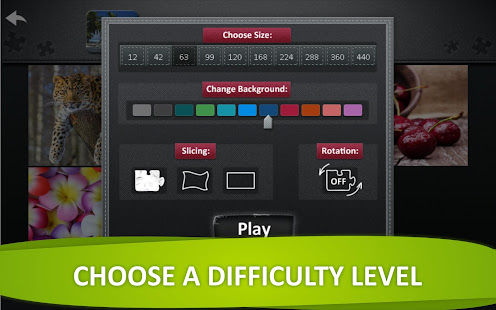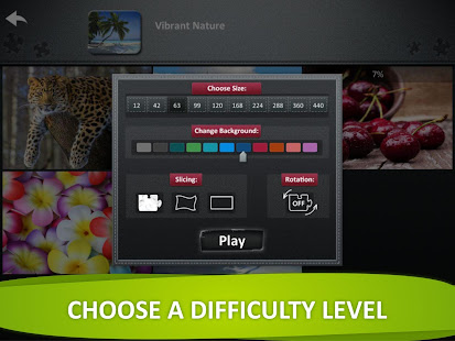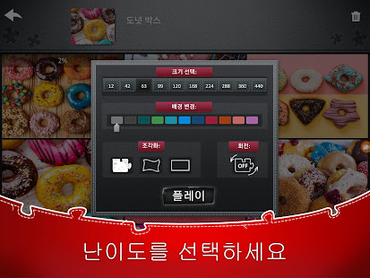 열 단계의 난이도 - 12조각부터 440조각까지! 크기, 퍼즐 조각 모양, 배경 색을 변경하고 퍼즐 조각을 회전할 수 있는지도 선택해 보세요.