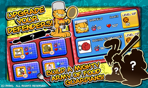가필드의 방어전은 얼간이 공격자들의 공격으로부터 존의 냉장고를 지켜야 하는 공략 게임과 타워 디펜스가 복합된 게임입니다. 여러분은 재량껏 사용 가능한 포크, 돌돌 말은 신문지, 싸구려 장난감 자동차 여러 대를 한 번에 발사할 수 있는 발사대 등 다양하고 웃긴 무기들을 갖고 있는 가필드를 조종해야 합니다.