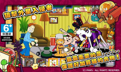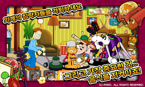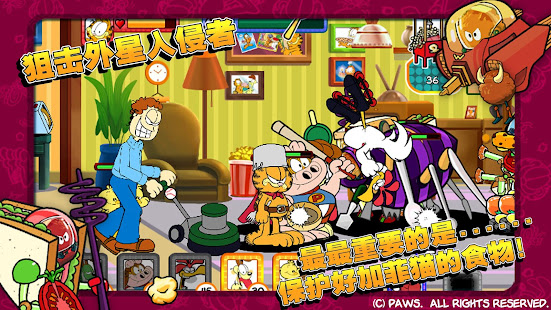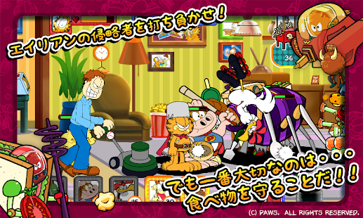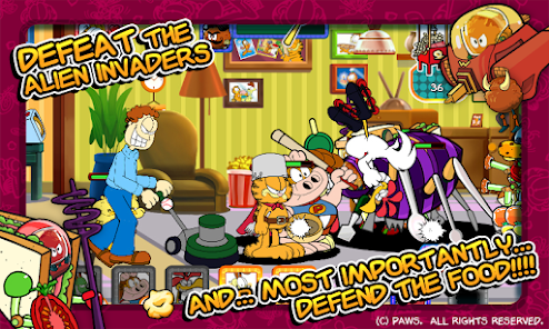 가필드는 침 흘리개 오디, 너멀, 웨이드, 올슨, 앨린 그리고 존 등 연재 만화 속의 캐릭터들을 불러올 수 있습니다. 외계인의 무법 상태를 무력화 할 준비를 하세요! 외계인들을 상대하려면 반사적인 반응과 현명한 사고가 필요할 것이고, 어떤 친구를 소환해 대응 공격을 할 지 결정해야 합니다. 한 번 잘못 움직이면, 가필드가 사람도 없고 라자냐도 없는 세상을 만들게 될 수도 있답니다.