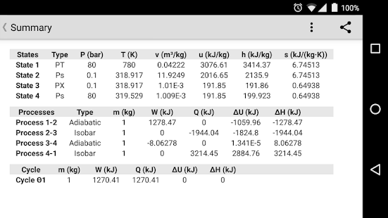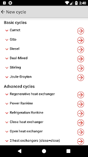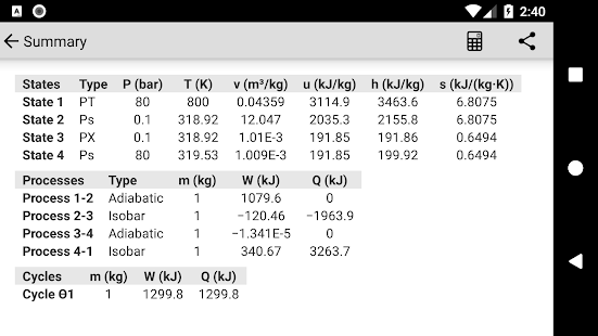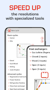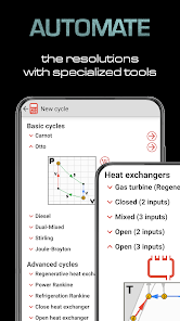 -사전 정의 된주기의 자동 계산 : Carnot, Otto, Diesel, Dual-Mixed, Stirling, Joule-Brayton, 회생 교환기, Ideal power Rankine, Basic 냉각 Rankine, 개방형 또는 폐쇄 형 열교환 기가있는 Rankine.