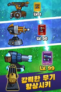 무기, 영웅, 포탑을 업그레이드하여 더 강력한 팀을 만드세요.