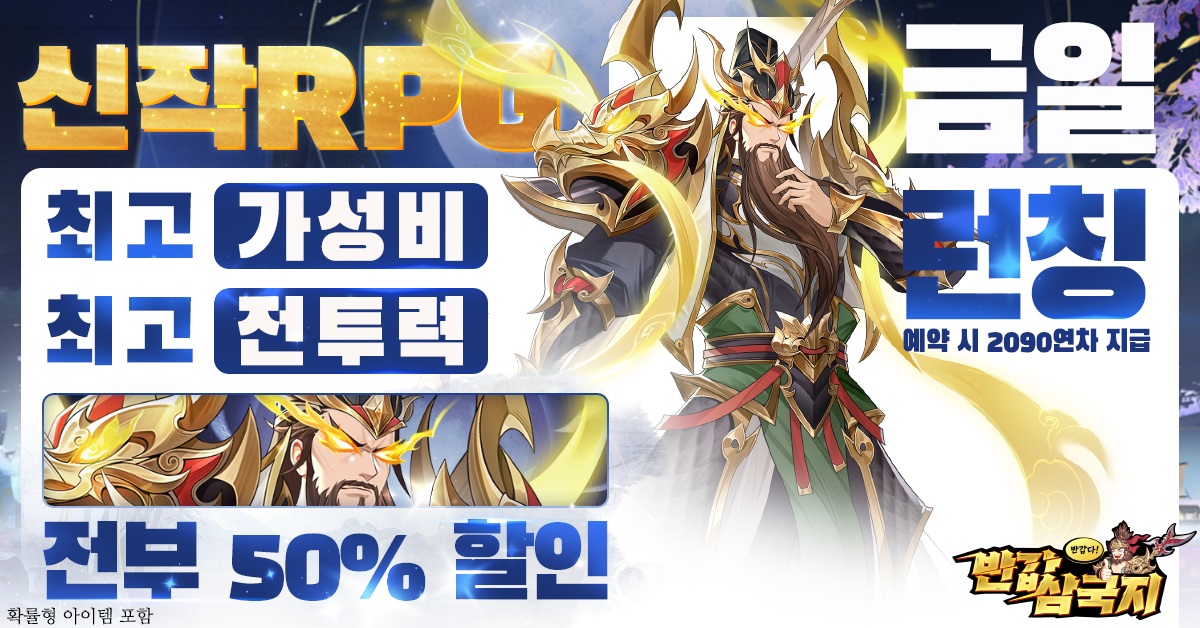 모든 아이템 반값! 접속만 해도 5성 신장과 2090연차 무료 지급! 반값 쿠폰으로 천하를 통일하세요!
