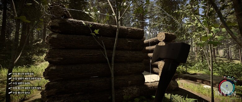 예를 들어 울타리를 설치할 때도 통나무를 세워서 지면에 고정한 뒤 도끼로 끝부분을 날카롭게 다듬거나 혹은 토대를 만들 때 통나무를 눕히고 반으로 갈라서 두는 과정 등을 직접 해야 합니다. 이러한 건축은 해당 자재를 들고 있을 때 화면 인터페이스로 표시를 해주니 쉽고 간편하게 만들 수 있었고 적합한 모션을 보여주면서 플레이어가 직접 해나간다는 느낌을 전달해줄 수 있었습니다.