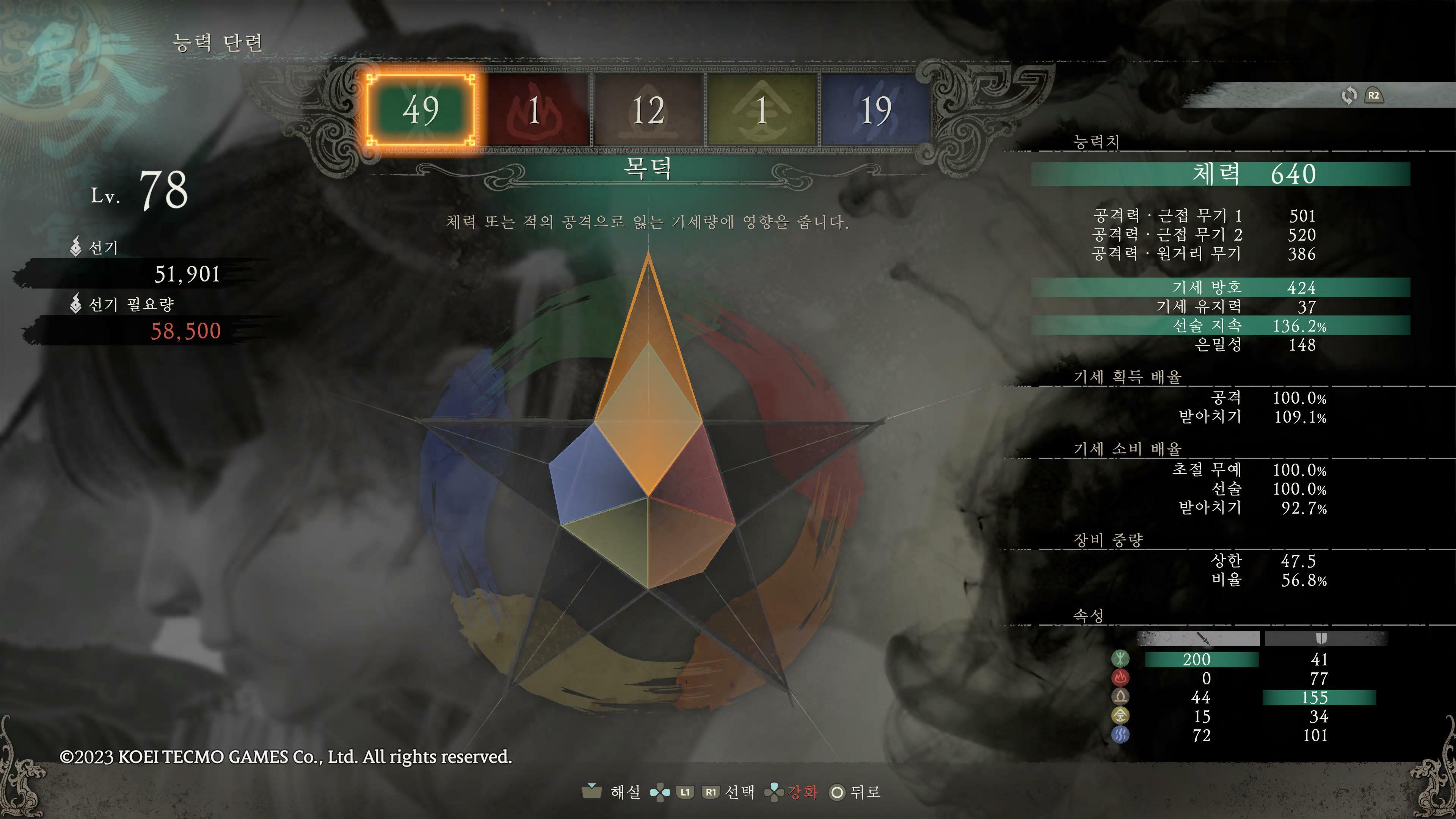 예를 들어 플레이어의 레벨을 ‘목(木)’속성 위주로 육성시킨다면, 다른 속성보다 체력 보너스를 많이 받고 적의 공격으로 잃는 기세량이 적어지는 효과를 얻습니다. 거기에 목속성 술법을 더욱 높은 단계까지 추가로 사용할 수 있게 되는 형태죠.