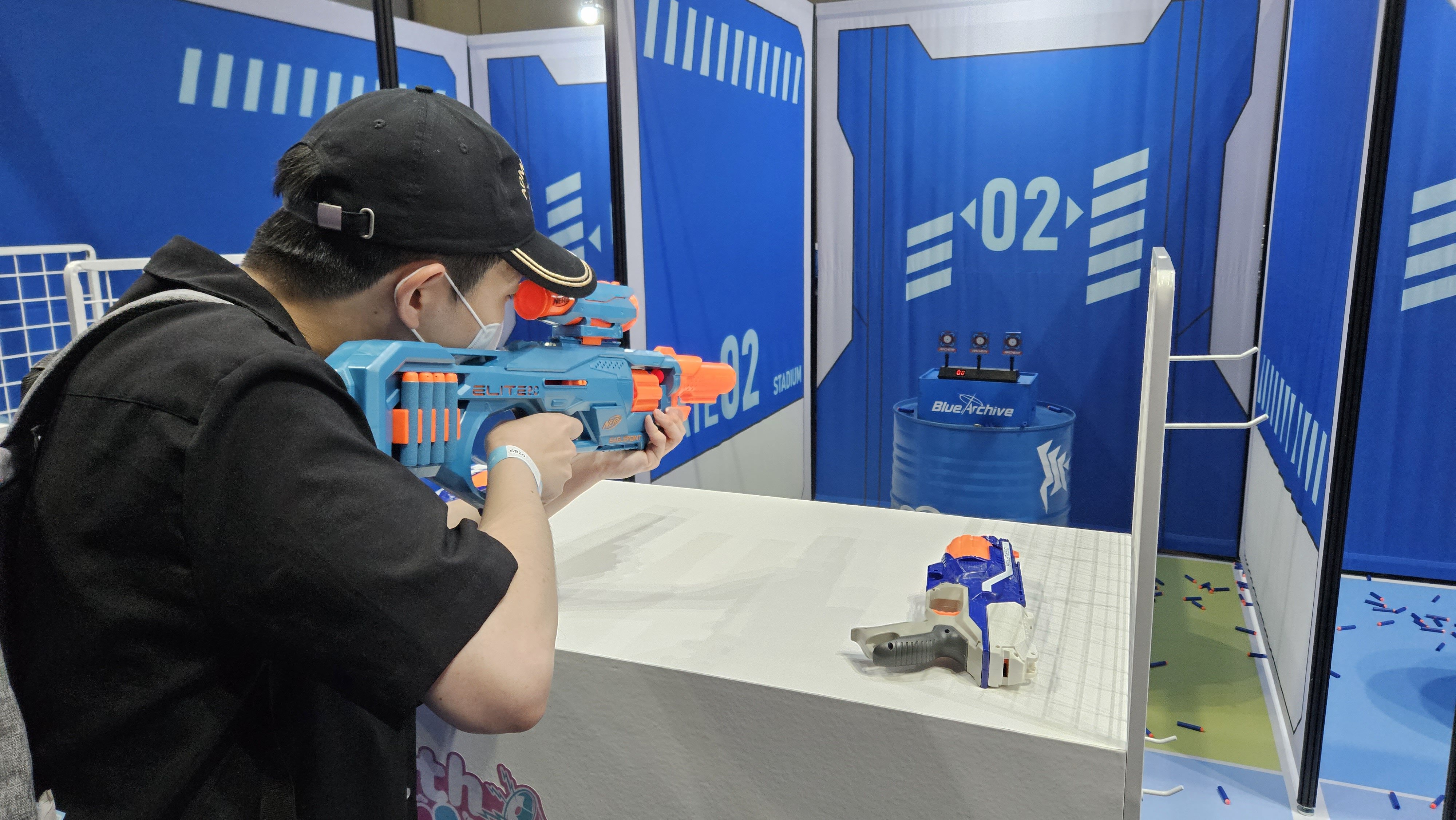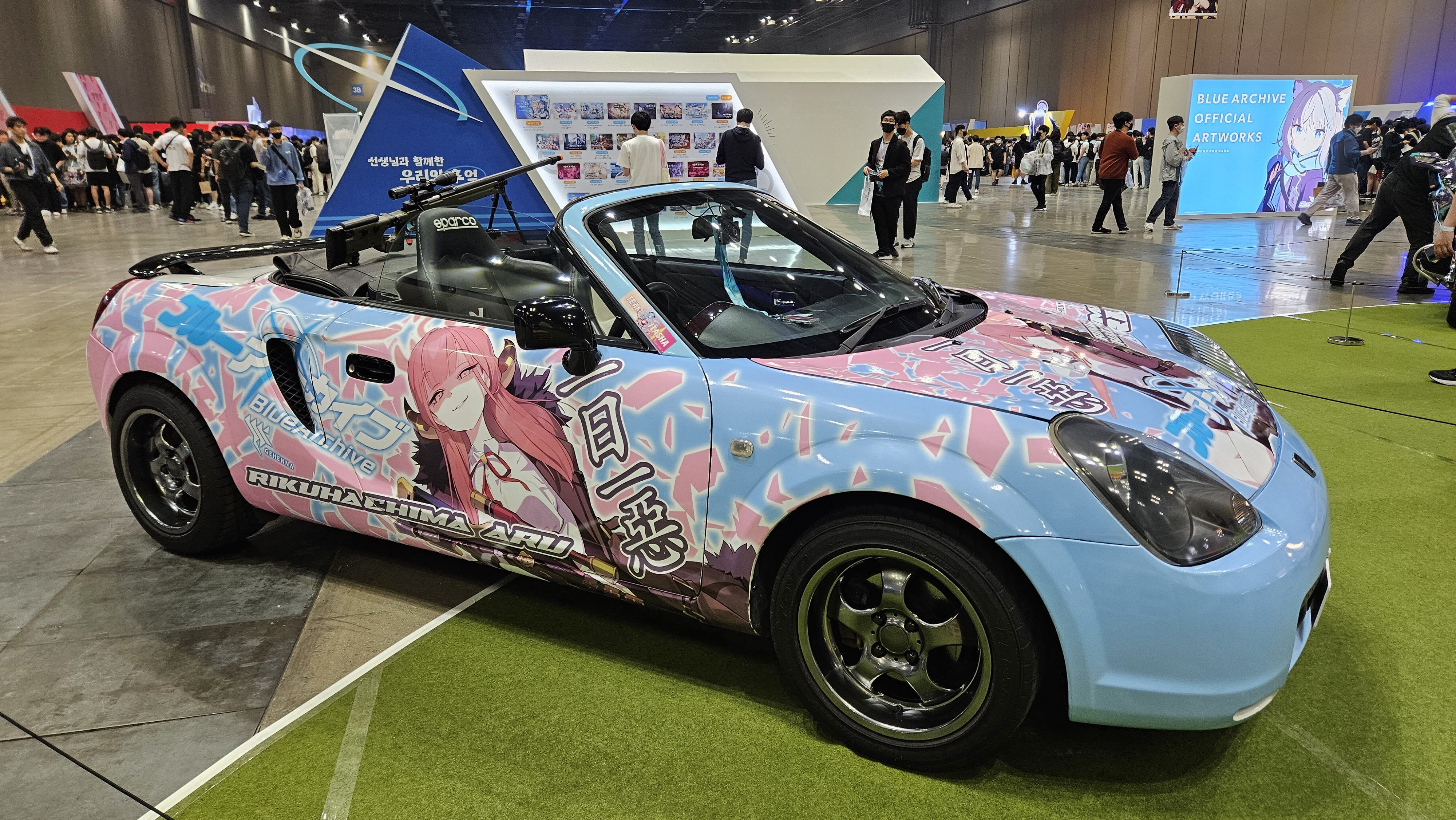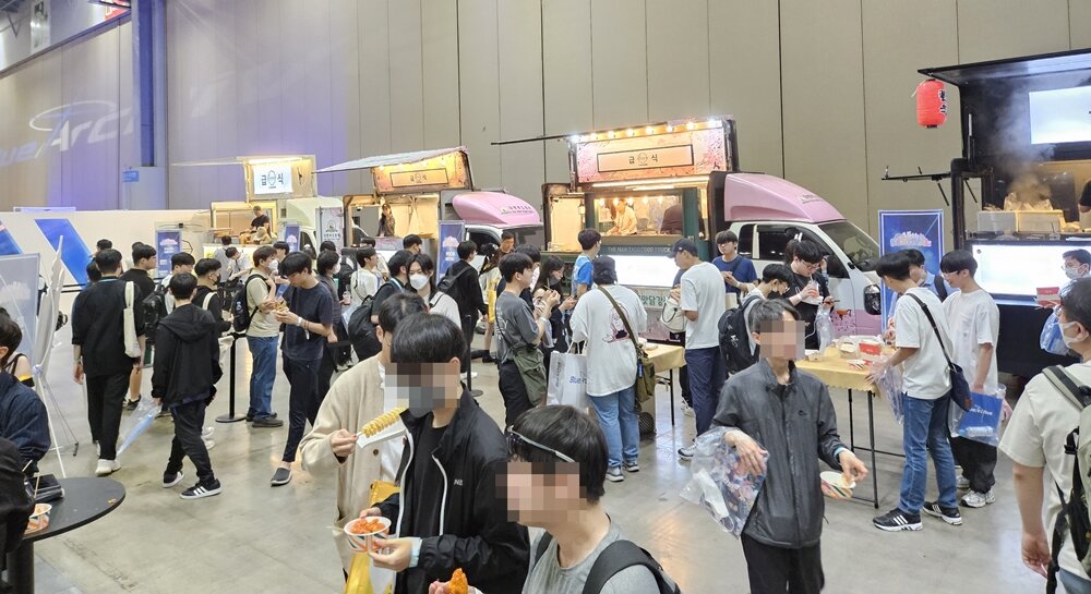 입장 확인 절차를 마친 뒤에 행사가 개최되는 1전시장 3홀로 들어서면, 게임 속 모모프렌즈 마스코트들과 함께 크기로 압도하는 대형 페로로 조형물, 그리고 블루 아카이브 캐릭터 스티커로 꾸며진 튜닝 자동차와 바이크가 전시된 포토존이 참관객들의 눈길을 사로잡는다. 페로로 조형물과 함께 인증샷을 남기거나 빈백이 넉넉하게 마련된 휴식 공간에 앉아 다음엔 어떤 부스를 방문할 것인지 미리 동선을 계획하는 등 다양한 방식으로 행사를 즐기는 유저들의 모습을 확인할 수 있었다.
