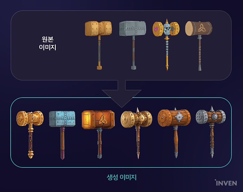 부가적으로 게임에서 아이템에 사용되는 특수한 용어가 있잖아요. 예를 들어 해머, 메이스처럼 비슷한 말이지만 게임에서는 형태와 용도가 아예 다르거든요. 저희는 이런 용어도 다 학습을 시켜서 원하는 이미지를 간단한 키워드로도 빠르게 얻을 수 있습니다.