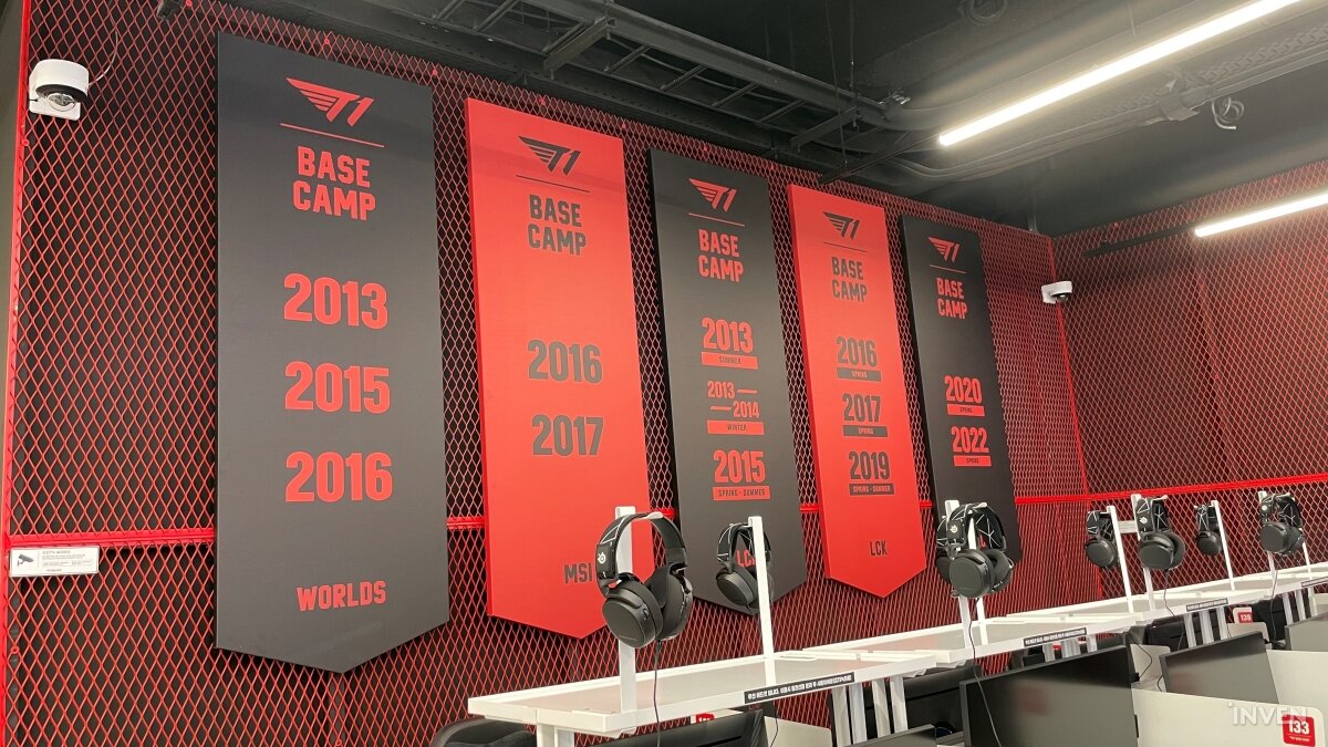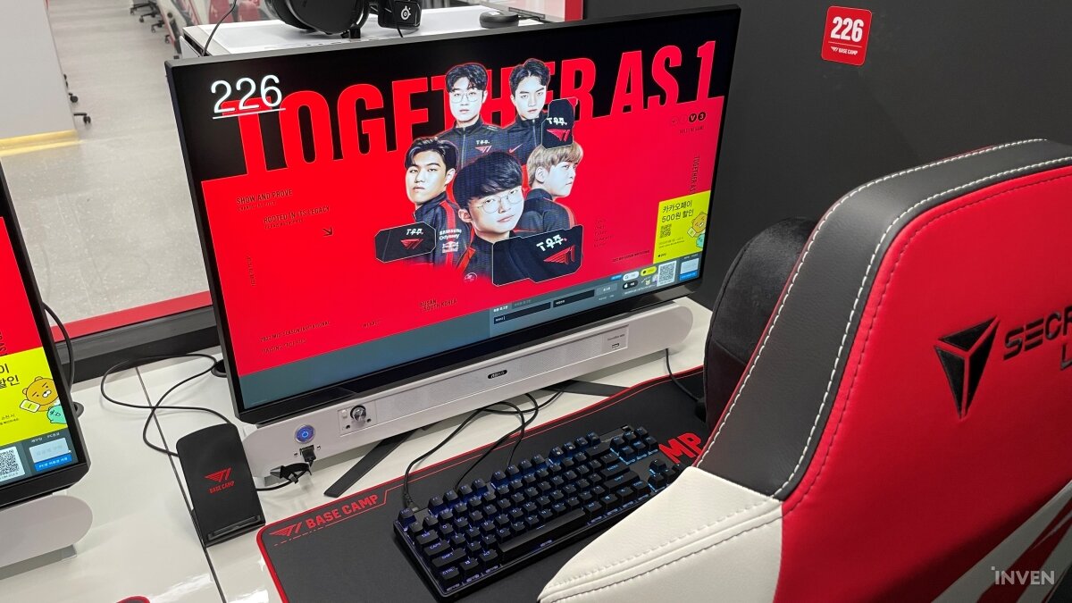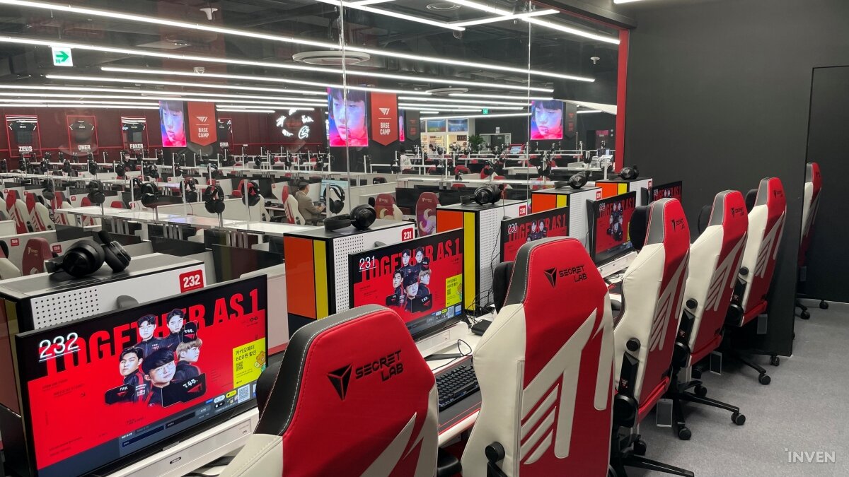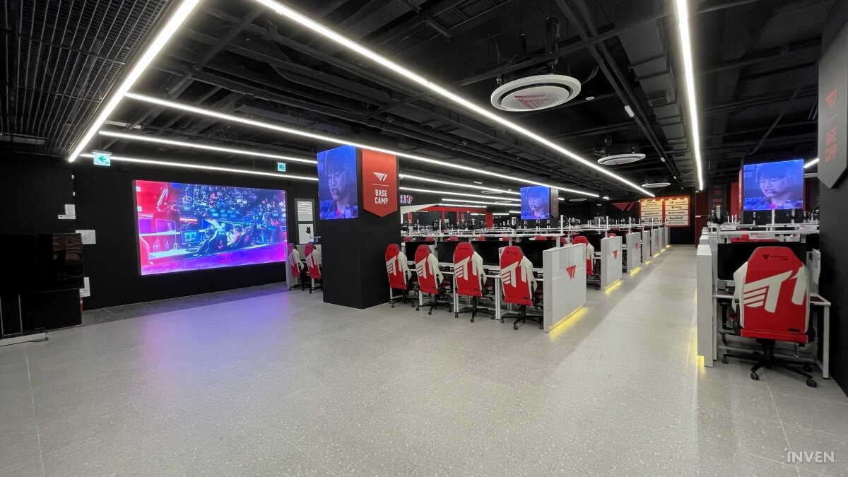 먼저 가본 T1 베이스 캠프는 무엇보다 쾌적한 환경이 기분을 좋게 했다. 공간은 260평 규모로, 높은 천장에 T1 시그니처 컬러인 레드와 블랙 화이트 인테리어가 인상적이었다. 기둥에 LED가 설치되어 있어 모든 각도에서 경기를 관람할 수 있었다. 특히 곳곳에 공기청정기가 지하임을 잊게 하는 쾌적함을 제공했다.