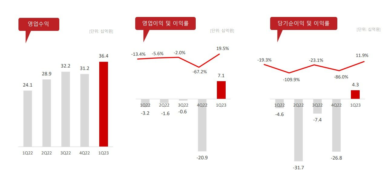 – 2023년 1분기 영업이익 71억 원 (전분기, 전년 기준 흑자전환)