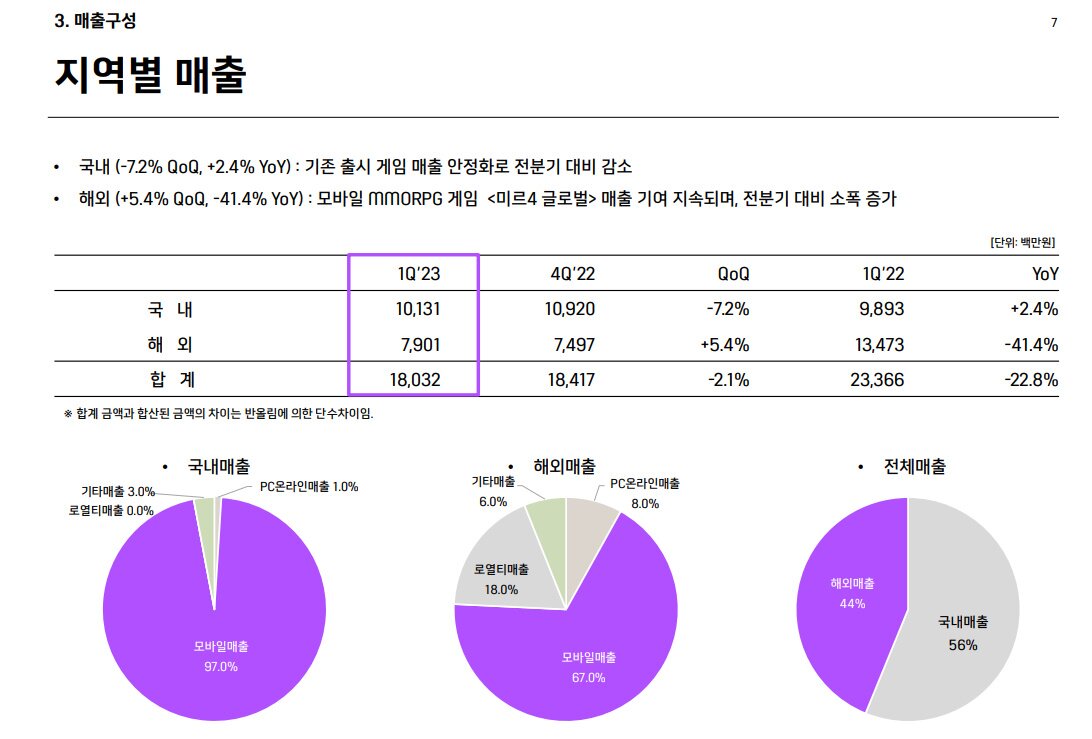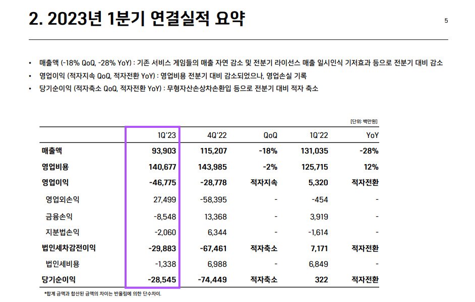 ㄴ 1분기 매출은 기 출시 게임의 매출 자연 감소 및 전기 라이센스 매출 일시인식 기저 효과 등으로 전기 대비 감소