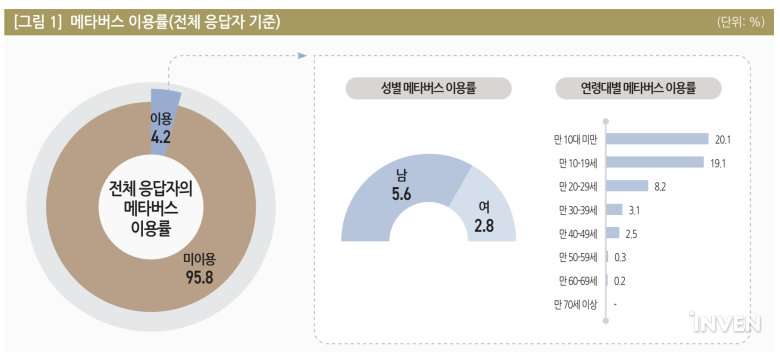 메타버스 이용률이 4.2%로 조사됐다. 메타버스는 연령이 낮을수록 이용률이 높았으며, 업무용보다는 게임용으로 쓰였다.
