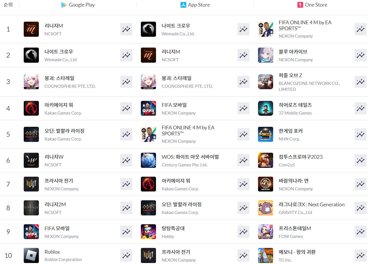 – 출시 전부터 기대를 모은 두 신작, 나이트 크로우와 붕괴: 스타레일은 출시 2주차에도 높은 매출 순위를 유지하고 있습니다. 위메이드의 모바일 MMORPG 나이트 크로우는 구글 플레이스토어 2위 기록을 유지하고 있으며, 애플 앱스토어에서는 1위를 기록하고 있습니다. 호요버스의 턴제 RPG ‘붕괴:스타레일’ 또한 MMORPG가 강세인 매출 순위에서 양대 마켓 모두 3위를 유지하고 있습니다. 다만, 다른 MMORPG와 달리 꾸준하게 지출을 요구하는 과금 요소가 없다는 점에서 머지 않아 순위를 지키기 힘든 시점이 다가올 것으로 예측 가능합니다.