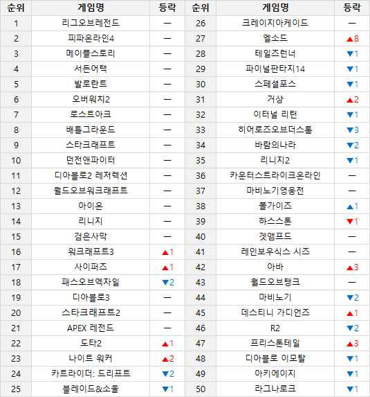 – 주말 연휴에 힘입어 전체적인 게임 사용량이 증가함에 따라, 이번 주에는 10위권 내 게임들의 순위는 변동 없이 유지되는 모습을 나타냈습니다. 어김없이 1위를 유지하고 있는 ‘리그 오브 레전드’부터 최근 시작된 MSI 2023등에 힘입어 이용량 증가를 보였으며, 그 뒤를 따르는 ‘피파온라인4’ 또한 어린이날 버닝 이벤트 등으로 PC방 이용 지표가 큰 폭으로 상승했습니다. 중위권에서는 지난 시즌 여파로 순위 상승에 성공한 ‘패스 오브 엑자일’의 순위가 2계단 하락했으며, PC방 사용량이 11% 가장 증가한 ‘나이트워커’는 전주 대비 2계단 상승한 23위에 자리했습니다.