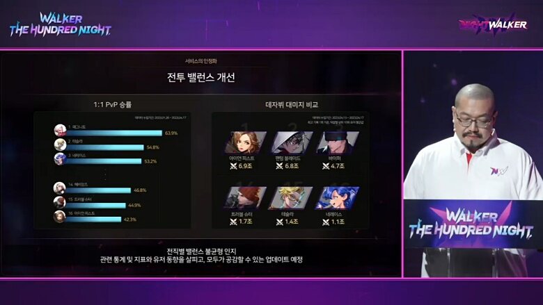 김태집 디렉터는 “향후 나이트 워커의 개발 방향의 두 축은 서비스 안정화와 콘텐츠 확장이다. 둘 다 매우 중요하지만 굳이 꼽자면 현재의 나이트 워커는 서비스 안정화를 더 중요하게 보고 있다. 이를 통해 나이트 워커가 즐겁고 쾌적한 경험이 될 수 있었으면 한다”고 전하면서 앞으로의 개선 사항과 하반기 로드맵 발표를 시작했다.