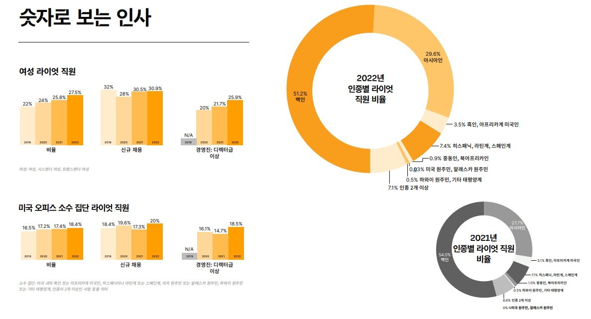 주목할 부분은 라이엇 게임즈가 이어온 ‘다양성과 포용성(D&I)’ 관련 활동들이다. 라이엇 게임즈에서는 매년 여성 직원이 늘어나고 있고, 현재는 27.5%에 달하는 여성 비율을 구성하고 있다고 소개했다. 흑인 또는 아프리카계 미국인 등 인종이 2개 이상인 ‘소수 집단’의 직원 비율 역시 매년 증가하고 있는 추세다. 라이엇 게임즈는 리포트를 통해 여성과 소수 집단의 채용과 임금 평등 추구 등 D&I 증진 활동을 계속 이어갈 것이며, 앞으로도 더 높은 곳을 지향할 것이라는 포부를 전했다.