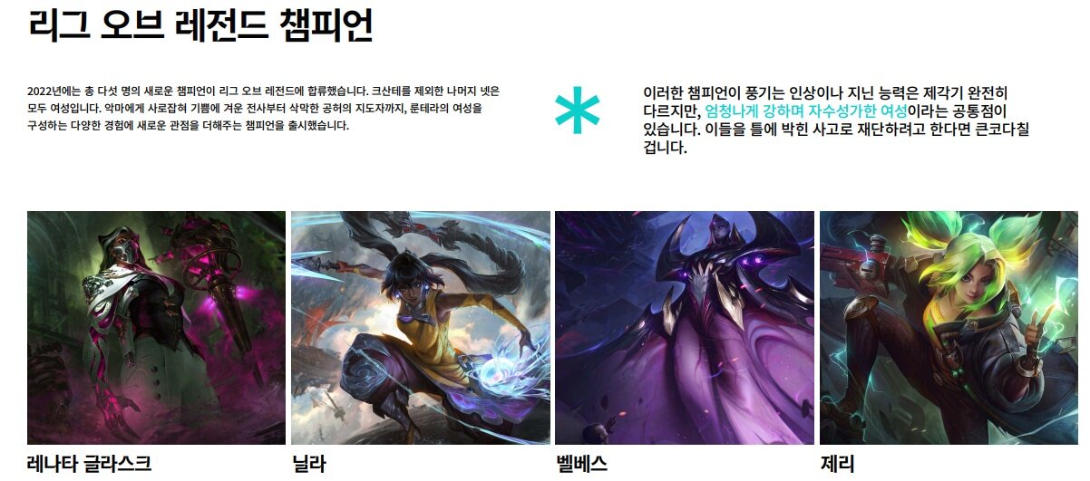 리그 오브 레전드와 발로란트 등 라이엇 게임즈를 대표하는 게임 속 활동에 대한 소개도 눈에 띈다. 라이엇은 지난 2022년에는 총 다섯 명의 새로운 챔피언을 추가했으며, 이중 크산테를 제외한 나머지 넷은 모두 ‘여성’이라며, 이들이 엄청나게 강하며 자수성가한 여성이라는 하나의 공통점을 가지고 있다고 소개했다. 발로란트에서는 리그 오브 레전드와 다르게 현실 세계에 더 가까운, 각각의 현실 문화를 대표하는 요원들을 최신 요원으로 추가했다고 전했다.