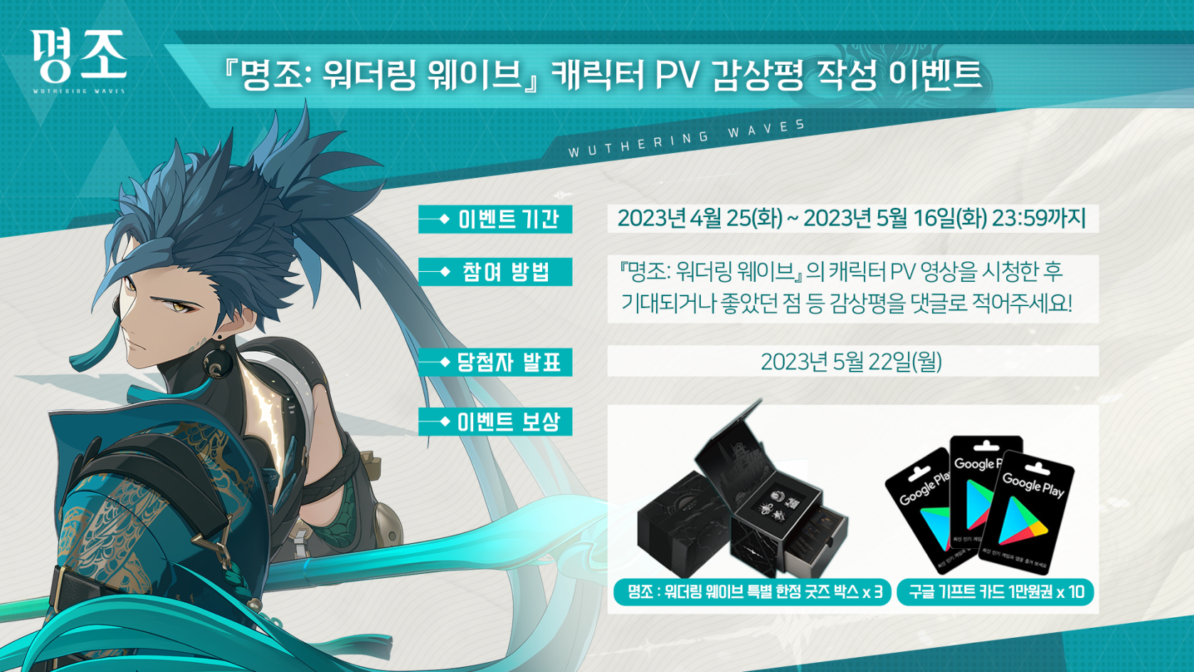 아울러 유저의 피드백 및 한국어 더빙 소식을 널리 전하기 위한 캐릭터 PV 감상평 작성 이벤트 및 RT 이벤트도 진행한다. 공식 라운지의 감상평 작성 이벤트 게시글에 댓글로 평을 작성한 유저나 이벤트 트윗을 RT한 유저에게 추첨을 통해 명조: 워더링 웨이브 특별 한정 굿즈 박스 혹은 구글 기프트카드 1만원권을 경품으로 지급하며, 이벤트에 대한 자세한 정보는 공식 라운지와 트위터를 통해서 확인할 수 있다.