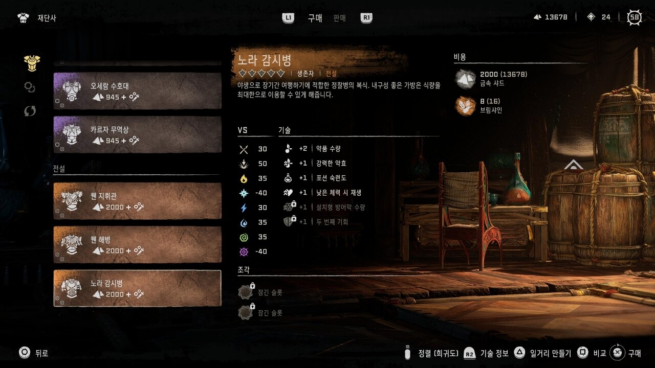 게다가 본편의 장비보다 좋은 점은, 업그레이드를 하는데 이미 모아둔 재료들이 통용된다는 것입니다. 예를 들어 본편에서 얻은 최강의 갑옷은 업그레이드에 무수히 많은 고난도 기계들의 부품이 필요하지만, 같은 성능을 가진 DLC 장비는 그보다 적은 재료를 써서 업그레이드가 가능한 식이죠. 물론 업그레이드에 브림샤인이 들어가는 것은 단점이지만, 대규모 교전 없이 주위만 잘 둘러봐도 어렵지 않게 찾을 수 있다는 점은 희망적입니다.