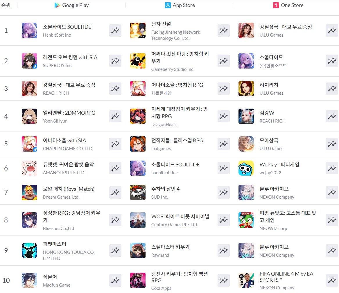 – 풀의 신 ‘나히다’ 픽업 효과로 지난 주말까지 매출 2위를 굳건히 유지하던 원신이 7위로 내려가면서, 아키에이지 워를 비롯한 모바일 MMORPG들이 다시 매출 상위권에 포진하는 형태가 되었습니다. 지난 주 6위까지 선전하던 수집형 RPG 디스라이트 또한 10위로 마감했습니다.