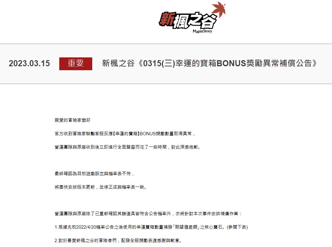 e스포츠에서는 스프링 플레이오프가 활발하게 진행되는 가운데, 2월에 이어 3월에도 대만 게임계에서는 확률 관련 논란이 불거졌다. 2년 전 대만 내 확률형 아이템 관련 법제화에 불을 당겼던 리니지M 대만 서버 퍼블리셔 감마니아가 3월에는 자사가 퍼블리싱을 맡은 메이플스토리 대만 서버에서 홈페이지에 뽑기 확률을 인게임에서 적용된 확률과 다르게 고지하면서 논란이 된 것이다.