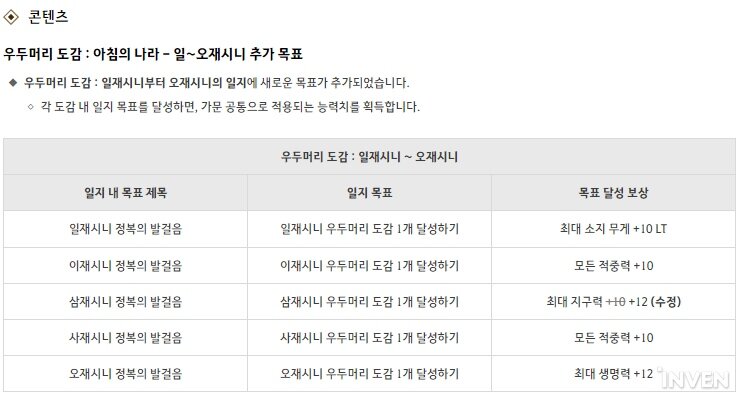 우두머리 도감 : 일재시니부터 오재시니의 일지에 새로운 목표가 추가됐다. 일재시니 우두머리 도감 1개 달성 시 최대 소지 무게 +10 LT를, 이재시니 도감은 모든 적중력 +10, 삼재시니는 최대 지구력 +12, 사재시니는 모든 적중력 +10, 오재시니는 최대 생명력 +12가 가문 공통으로 능력치가 적용된다.