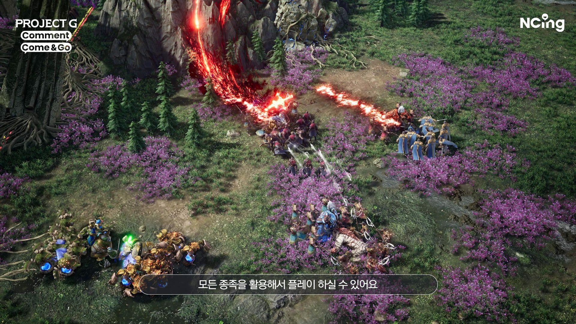 엔씨는 지난 3월 프로젝트G의 트레일러 영상을 통해 개발 중인 모습을 처음 공개했다. 대규모 전쟁 기반의 전략 게임으로, 한정된 자원을 모아 성장하며 길드 간 영토 전쟁 속에서 다양한 전술을 구사할 수 있다. ▲다양한 개성을 가진 종족과 캐릭터 ▲근거리, 원거리 유닛을 활용한 전투 방식 ▲오브젝트 점령과 영토 경쟁 과정에서 활용되는 ‘드래곤’과 ‘전략병기’ ▲개인 간 전투에서 대규모 집단으로 확장되는 전쟁 등이 특징이다.