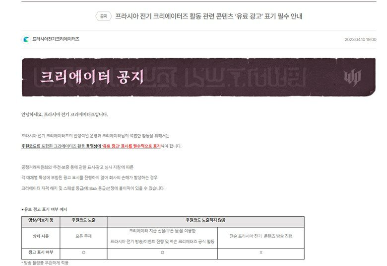 ▲ 후원 코드를 노출하면 유료 광고 표기를 해야 하지만 부정적인 사례들이 존재해 넥슨에서도 따로 공지를 했다.