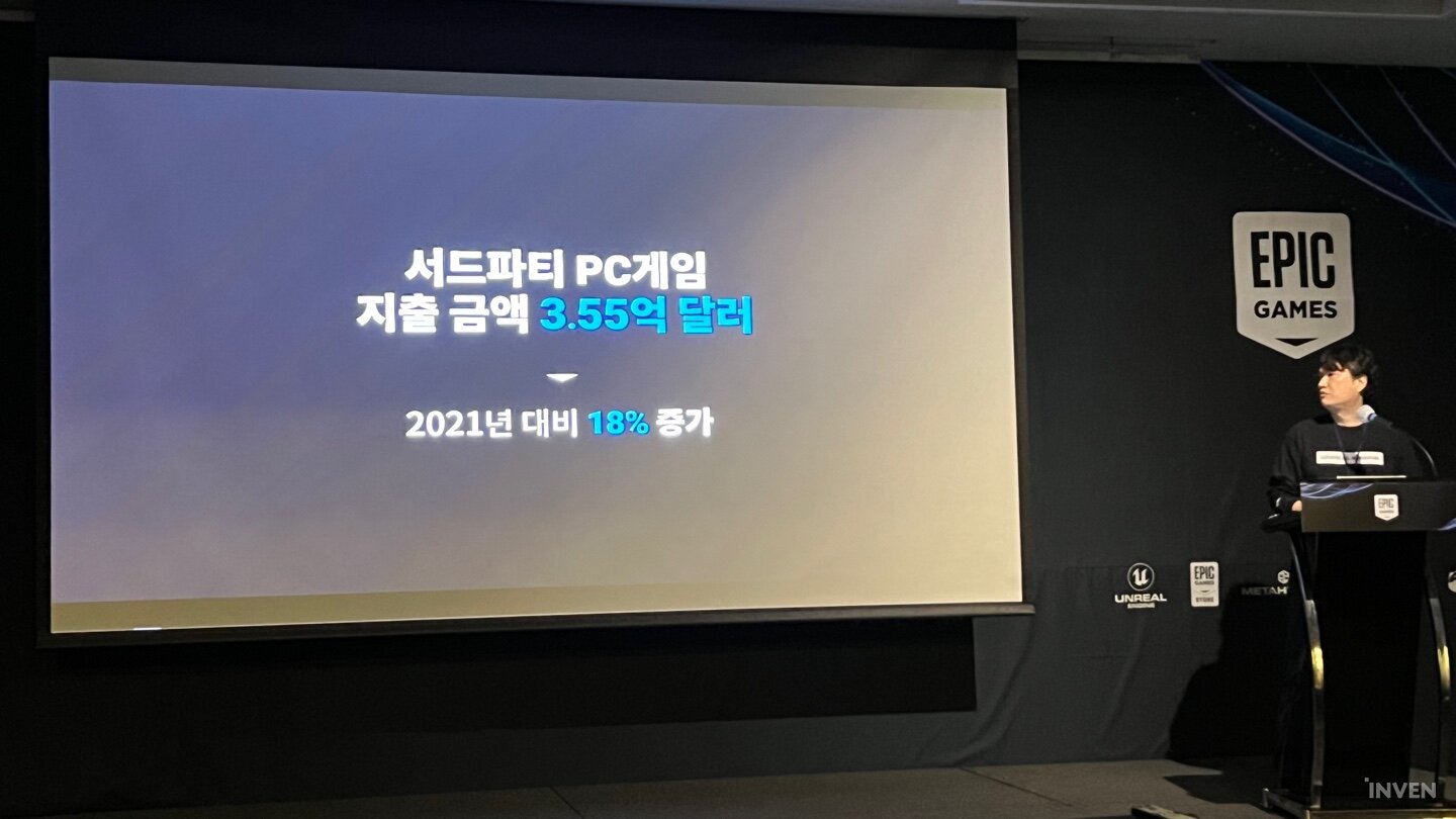 게이머 및 개발자를 위한 에픽게임즈 스토어 관련 정책도 언급됐다. 2022년 기준 PC 유저 수는 전년 대비 3,600만 명 증가한 2억 3,000만 명으로 집계된 가운데 에픽게임즈 스토어의 작년 최고 MAU는 6,800만 명 이상을 기록했다. 작년 에픽게임즈 스토어 사용자의 서드 파티 게임 구매액은 3억 5,500만 달러(한화 약 4,683억 원)으로, 2021년 대비 18% 증가했다.