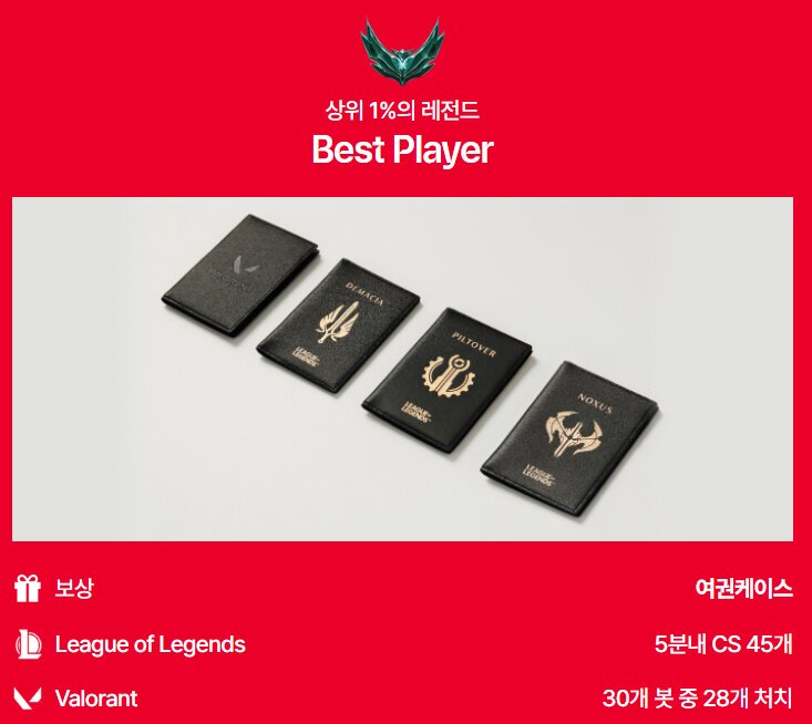 이 또한 평소 CS 먹는 연습이 꾸준히 되어 있지 않은 게이머에게는 난관으로 다가올 만큼 난이도가 녹록치는 않았습니다. 5분 이내에 최소 41개의 CS를 달성해야 특별한 보상을 얻는 조건을 충족하며, 45개 이상을 달성할 경우 ‘상위 1%의 레전드’로서 영광의 보상인 ‘여권 케이스’를 얻을 수 있습니다.