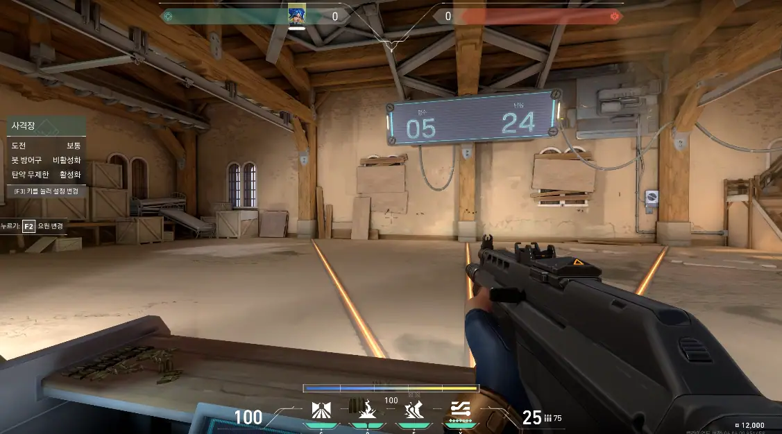 먼저 플레이해 본 것은 요즘 한창 인기를 얻고 있는 FPS ‘발로란트’입니다. 일반 게임은 할 수 없는 체험존의 특성 상 미션은 사격장의 로봇을 처치하는 것으로 진행되며, 제한된 시간 동안 처치한 로봇의 수에 따라 특별한 보상을 얻을 기회도 주어집니다. 총 30개의 로봇 중 24개 이상을 처치한 시점부터 보상을 얻을 수 있기 때문에 처음 게임을 접한 이용자에게는 꽤 난이도가 높은 편에 속합니다.