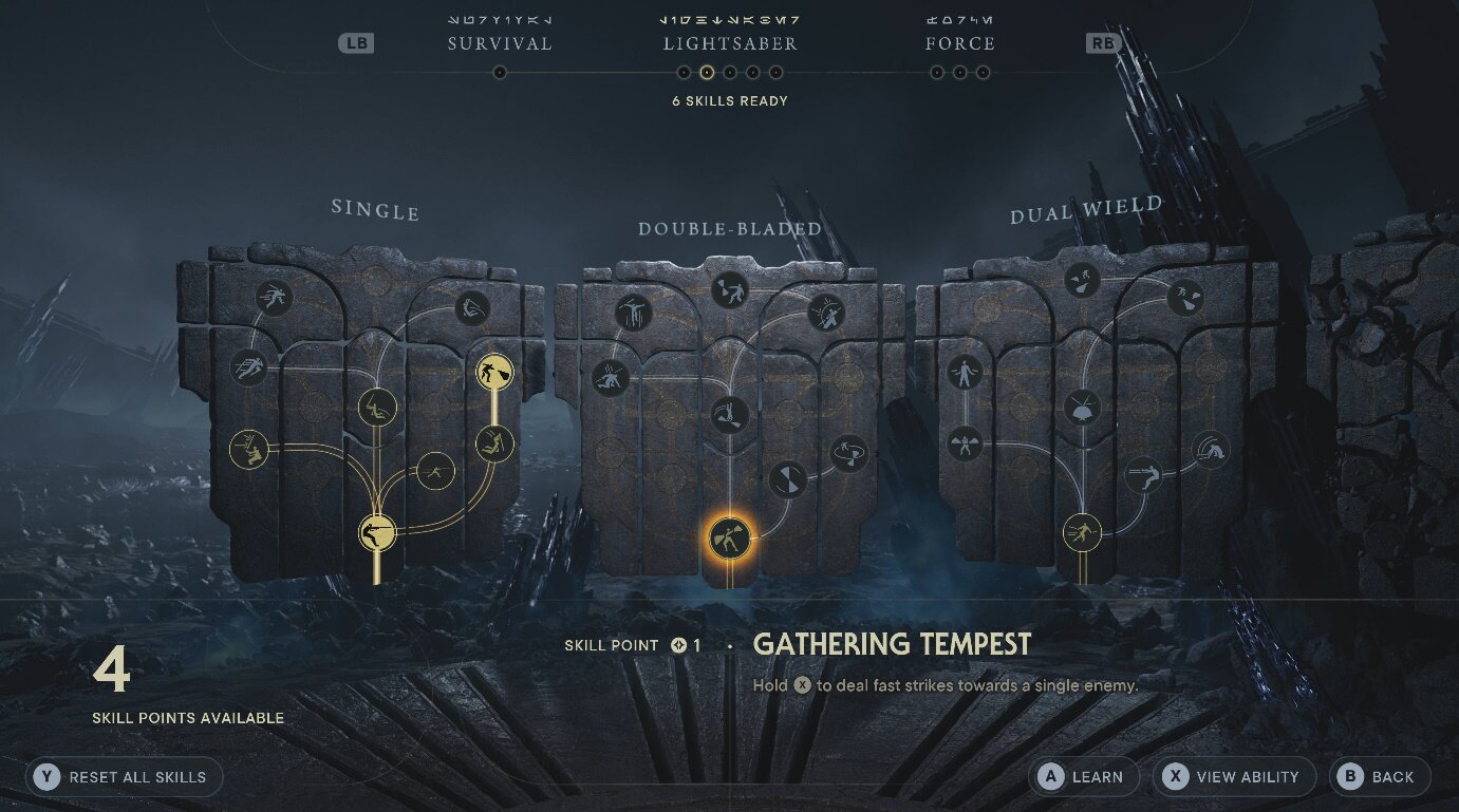 이에 따라 스킬 트리 자체도 전작과 비교해 크게 확장됐습니다. ‘스타워즈 제다이: 서바이버’의 스킬 트리는 ‘생존’, ‘라이트 세이버’, ‘포스’ 세 가지를 중심으로, ‘라이트 세이버’ 탭에는 총 다섯 가지의 ‘자세’에 대한 스킬 트리가 제공됩니다. 생존 탭은 말 그대로 체력 증가 등 생존에 필요한 효과가 모여 있으며, 포스에서는 전투에서 활용할 수 있는 포스를 강화할 수 있는 기술들이 대거 포함되어 있습니다.