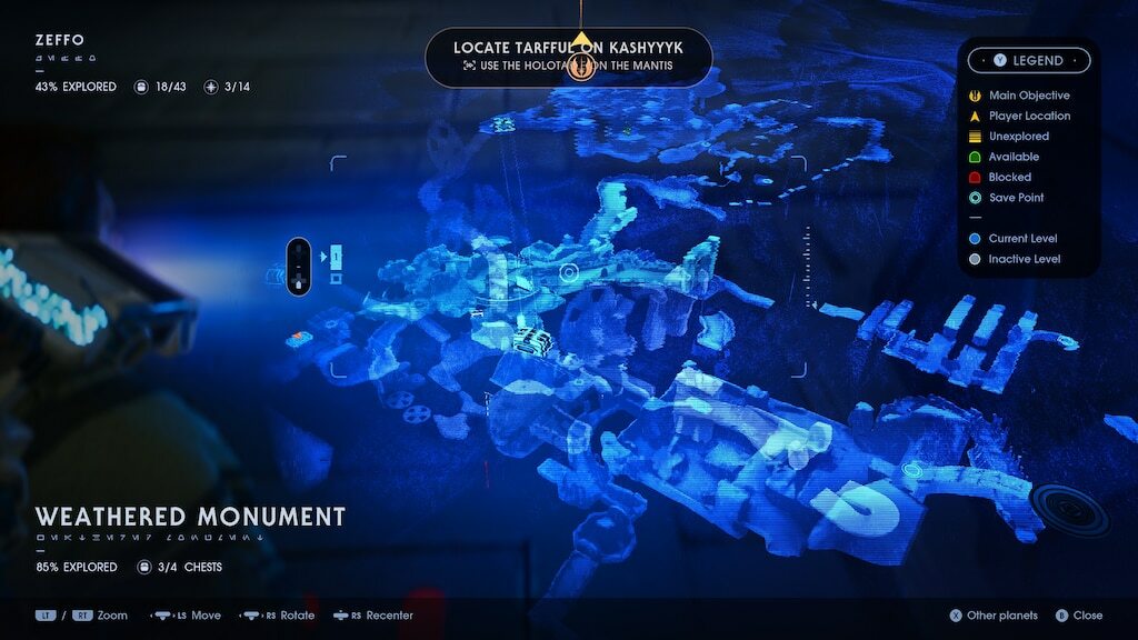 여러 자세의 추가와, 이를 통한 전투 방식의 변화도 의미 있는 개선이지만, ‘스타워즈 제다이: 서바이버’의 가장 확실한 변경점은 아무래도 전작에서 아쉬움을 많이 산 ‘맵 시스템’의 개편이 아닐까 생각합니다. 오더의 몰락 시절 ‘길치는 하지도 못하는 게임’이라는 둥 게임 내 길찾기의 어려움을 호소하는 커뮤니티의 원성이 자자했던 것을 생각하면, 이번 지도 시스템은 그야말로 혁신에 가까운 수준으로 변화했습니다.
