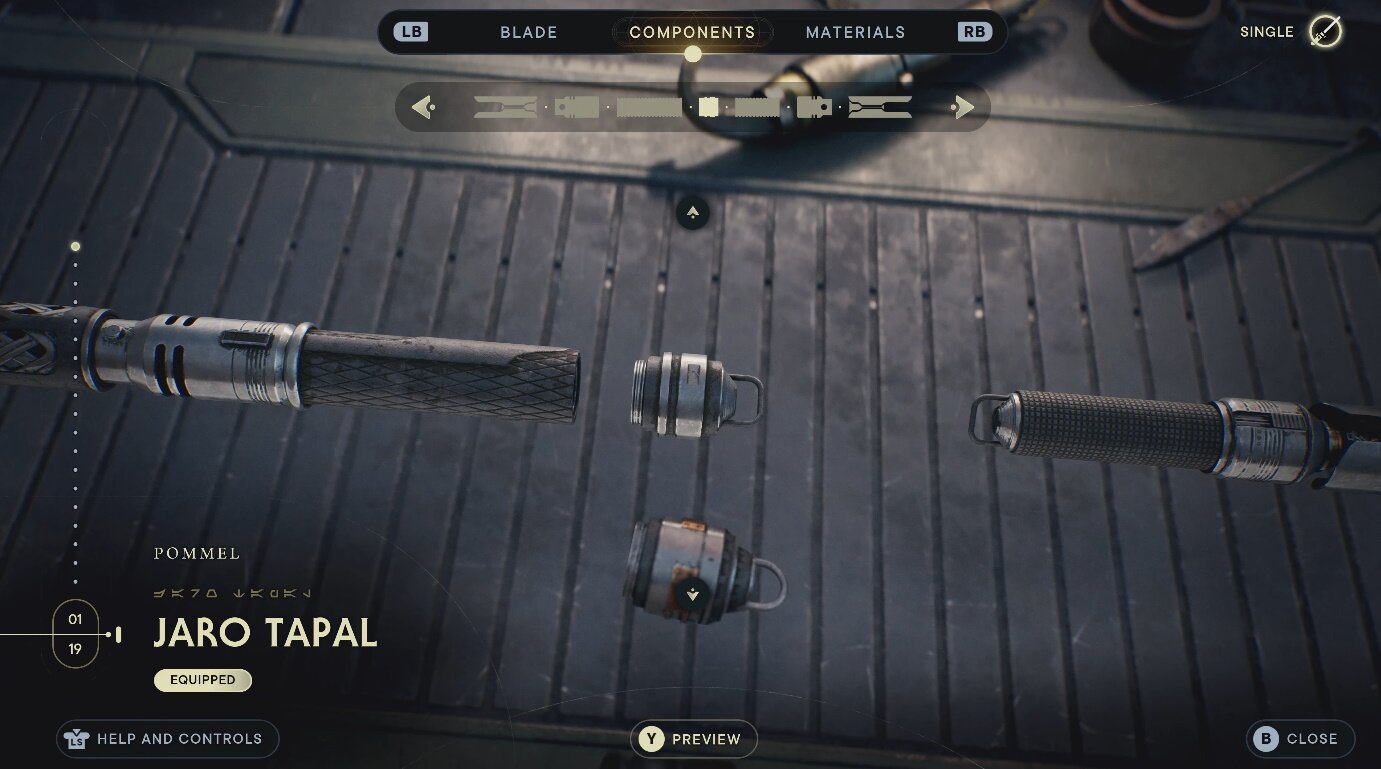 ‘오더의 몰락’의 광선검 커스터마이징은 판초 일변도의 의상과 달리 꽤나 멋진 경험을 제공했습니다. 그런데 이번 후속장에서는 한층 더 나아간 시스템을 보여줄 전망입니다. 파츠는 자유자재로 바꿀 수 있었지만 색상과 재질을 통일해야 했던 전작과 달리, ‘스타워즈 제다이: 서바이버’에서는 라이트 세이버의 힐트를 구성하는 각 파트별 재질과 색상을 자유롭게 구성할 수 있었습니다. 그만큼 최종 완성품의 경우의 수도 많아졌으니, 정말 나만을 위한 라이트 세이버를 조립할 수 있을 예정입니다.