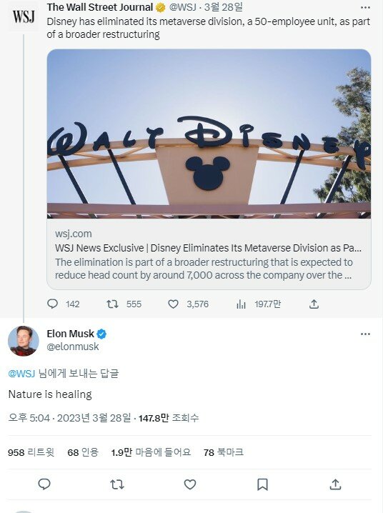 일론 머스크 CEO는 28일, 월스트리트 저널이 보도한 디즈니의 메타버스 사업 정리 소식에 “자연이 치유되고 있다(Nature is healing)”고 답글을 남겼다. 메타버스 키워드가 세상의 트렌드처럼 퍼져나가는 동안에도 이 개념을 믿지 않았던 그가 ‘메타버스’를 질병에 비유하고, 이제야 세상이 메타버스라는 질병을 극복했으며, 회복하는 과정에 이르렀음을 시사하는 글이다.