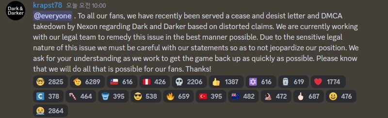 이에 아이언메이스는 금일(25일), 오전 10시 ‘다크 앤 다커’ 공식 디스코드를 통해 “최근 넥슨으로부터 왜곡된 주장에 근거한 ‘다크 앤 다커’ DMCA 침해와 서비스 중단 편지를 받았다”라며, “현재 이 문제를 해결하기 위해 법무팀과 최선을 다하고 있다”고 전했다.