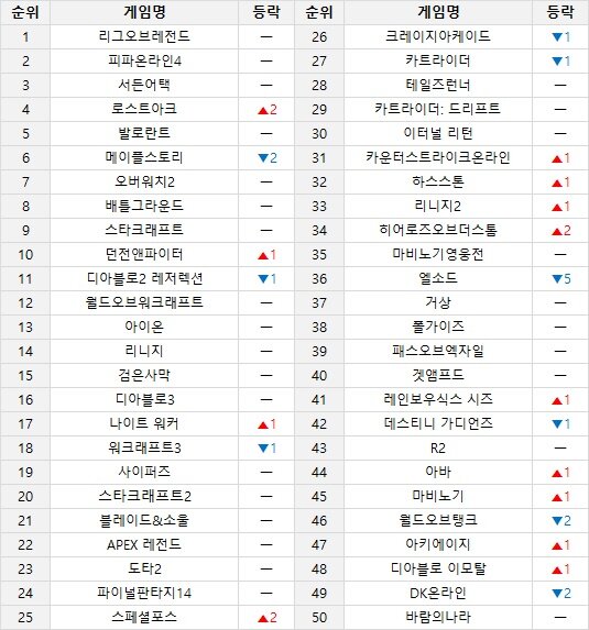 – 한편, 새로운 게임들이 PC방 점유율 순위에 모습을 드러내기도 했습니다. 지난 주말 오픈 베타를 진행한 디아블로4와 아키에이지 워가 그 주인공입니다. 디아블로4는 PC방 점유율 14위에 랭크되며, 정식 출시에 대한 기대감을 고조시켰고 아키에이지 워는 27위로 진입하면서 PC방에서도 성공적인 출시를 알렸습니다.