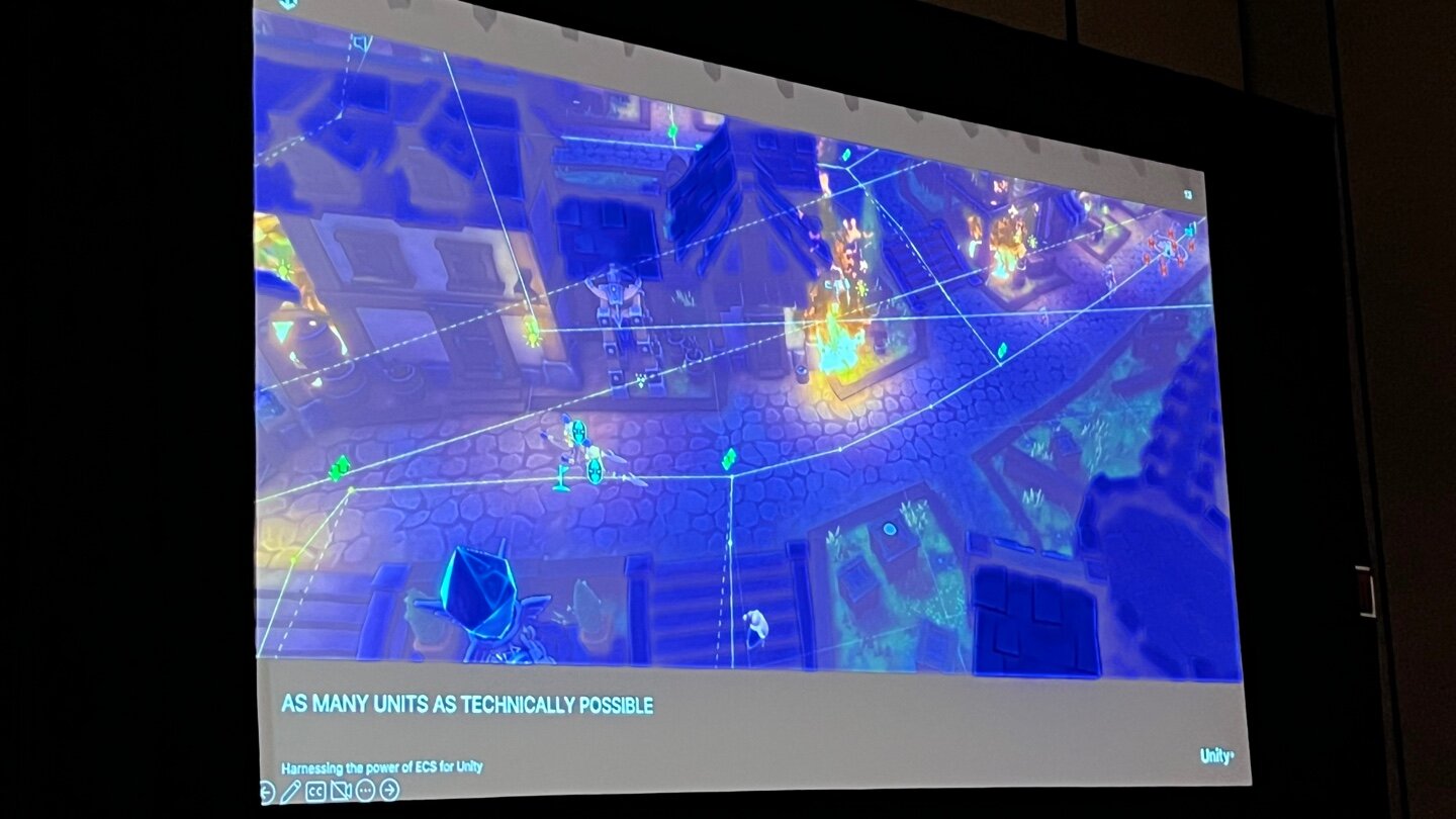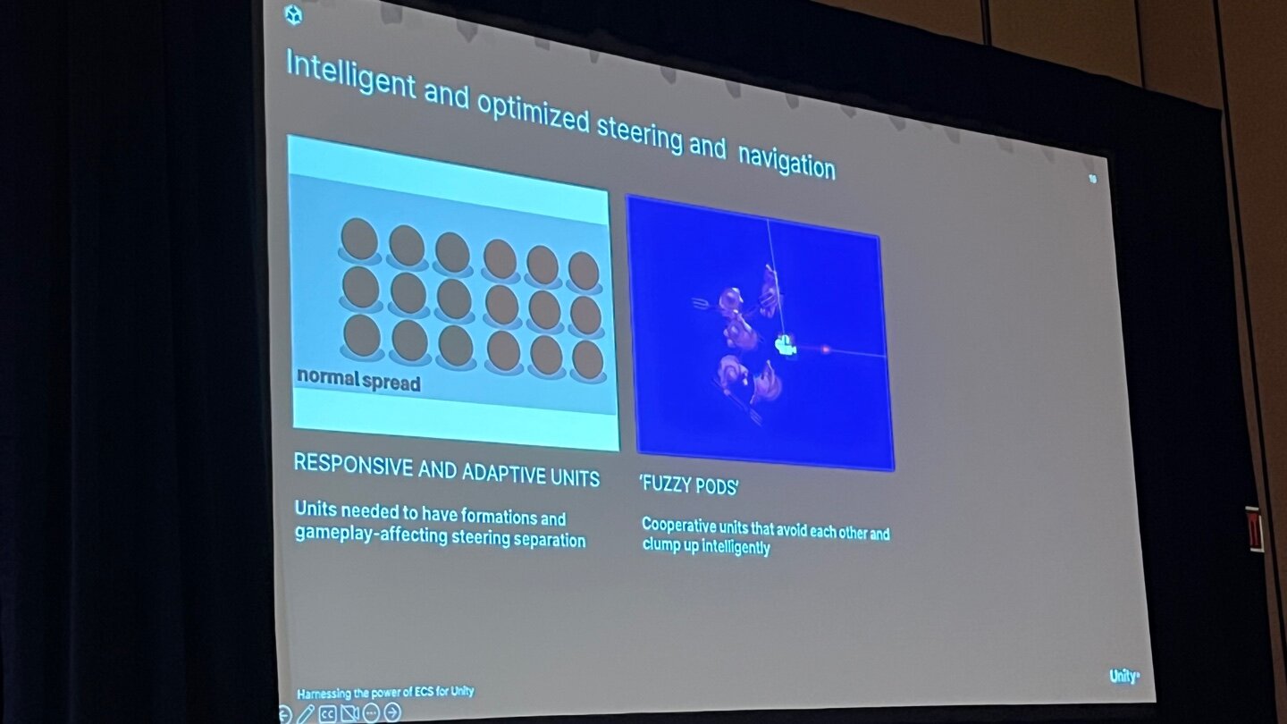 그간 시중에 존재했던 모바일 RTS류가 아닌, PC와 닌텐도 스위치 등 멀티플랫폼에서 다양한 유형의 게이머들이 코어한 게임플레이를 즐길 수 있도록 기획한 만큼 여러 가지 도전적인 과제들이 있었다. 라라비 CTO는 이를 구축하는 과정에서 DOTS로 다양한 기능을 구축할 수 있었다고 설명했다. 통상 DOTS, ECS는 다수의 오브젝트를 더욱 원활하게 구현할 수 있다는 점만 강조됐다. 그러나 라라비 CTO는 구현뿐만 아니라 관리 차원에서도 훨씬 편해졌다고 설명했다.