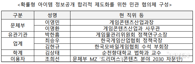 문체부는 TF를 유관기관, 업계·학계, 그리고 청년과 이용자들의 목소리를 들을 수 있도록 구성했다고 소개했다. 게임물관리위원회, 한국게임산업협회, 한국모바일게임협회가 포함되었으며, 과거 ‘게임산업법’ 전부개정안 연구용역의 연구책임자를 맡았던 순천향대학교 법학과 김상태 교수가 참여한다.