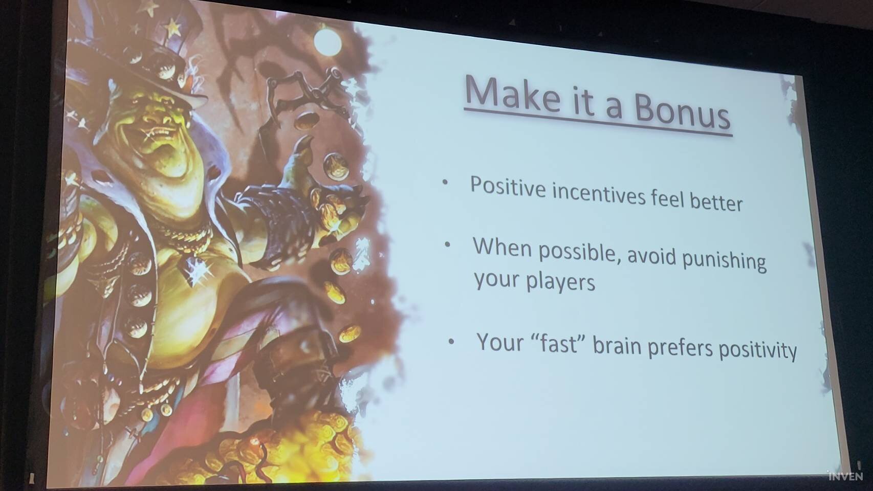 정리하면, 게임 내에서는 적어도 모두가 스스로를 영웅처럼 느껴야 한다. 물론 게임 플레이 내내 그럴 수는 없지만, 적어도 한동안은 그런 기분이 들도록 해야 한다. 또한, 게이머가 스스로 선택하지 않는다면 너무 많은 선택이나 복잡한 UI등을 마주하게 해서는 안된다. 영웅은 공부 따위 안 한다.