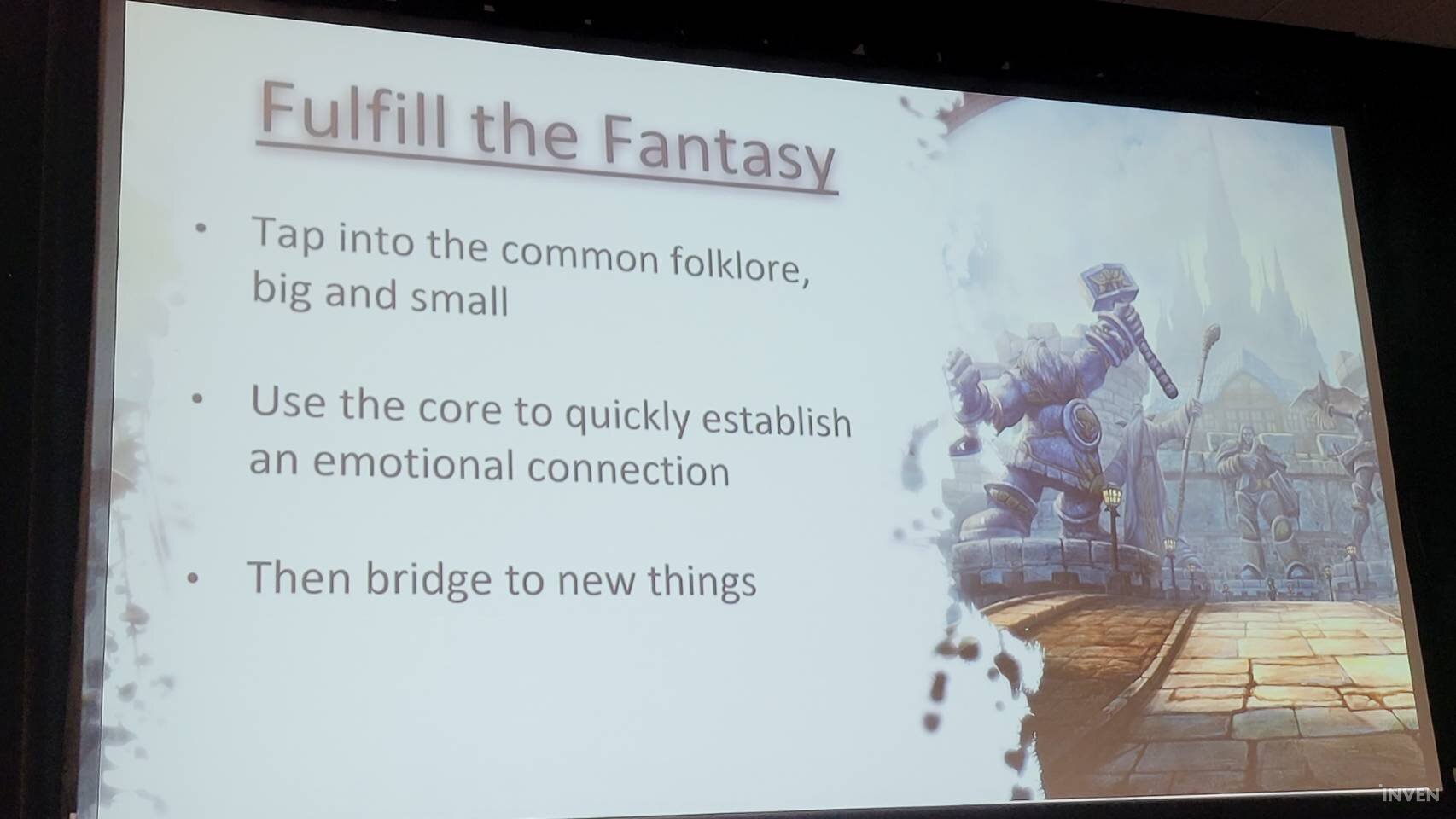 오버워치는 마블 어벤저스 같은 슈퍼 히어로의 집합에서 영감을 얻었고, 디아블로 시리즈는 성경에서 힌트를 얻어 만들어졌다. 인간이 가지는 대부분의 환상은 이미 있는 것, 그 중에서도 멋지고 흥미로우며, 신기하고 기괴한 것들로부터 만들어진다. 환상을 충족시키기 위해서는 일단은 환상이 무엇인지를 알아야 하고, 이 환상은 생각보다 멀리 있지 않다는 걸 인지해야 한다.