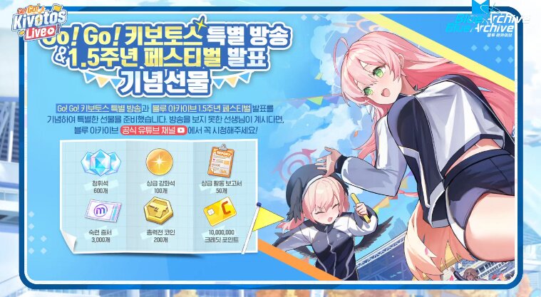 가장 마지막으로 1.5주년 발표를 기념하는 특별 선물 정보가 공개됐다. 특별 선물에는 청휘석 600개와 천만 크레딧 포인트 등 여섯 가지 인 게임 아이템이 포함됐다. 김용하 PD는 블루 아카이브를 사랑하는 모든 유저들을 위해 준비한 특별 선물이라며, 지금 게임에 접속한 모든 유저가 획득할 수 있다고 소개하며 방송을 마쳤다.