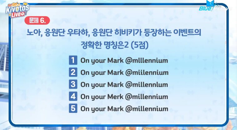 코멘터리 이후 생방송을 시청하는 글로벌 유저들이 함께 참여할 수 있는 퀴즈 이벤트가 진행됐다. 상품으로는 1.5주년 기념 인사를 보내온 히비키, 우타하, 코토리 성우의 사인지가 준비됐으며, 퀴즈는 현장의 김용하 PD와 박병림 PD가 직접 제출하는 방식으로 꾸며졌다. 총 여섯 개의 문제가 제출됐으며, 1.5주년 방송을 꼼꼼히 지켜본 유저들이라면 충분히 맞출 수 있는 문제들로 채워졌다. 해당 퀴즈 폼은 3월 26일 23시 59분까지 열려있으며, 추후 당첨자 정보가 별도로 공개될 예정이다.