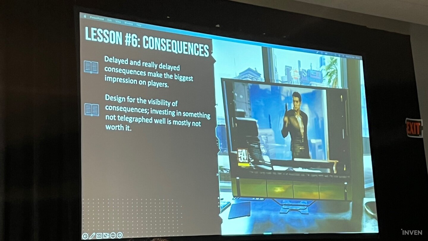 사스코 디렉터는 사이버펑크2077 출시 이후, 스트리머들이 멜스트롬 갱단에 들어가서 무례하게 구는 멜스트롬 갱단을 제압하는 선택지를 고르는 장면을 예시로 들었다. 당시 많은 스트리머들이 늑장부리면서 일부러 떠보는 행태를 보여준 멜스트롬 갱단에 열받아 있었고, 그때 마침 V의 행동 선택지에도 열받아 있다는 것이 명확한 내용이 담겨있었다. 그걸 고르면서 스트리머들은 망설임 없이 멜스트롬 갱단을 욕하고, V 역시도 그때 욕하는 장면이 오버랩되면서 유저와 그 분신인 캐릭터의 선택이 일치하는 결과가 나온 셈이었다.